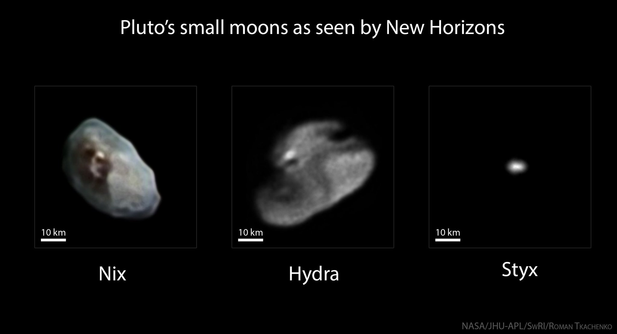 Když se řekne New Horizons, každému se vybaví Pluto, někteří doplní, že tahle sonda snímkovala i největší měsíc Charon. Ale co zbylé měsíce? I na ně sonda pohlédla svými kamerami, ale jelikož jde o malá tělesa, která navíc obíhají relativně daleko od Pluta, bylo už předem jasné, že není možné pořídit mimořádně detailní fotky. Sonda proto zaměřila svou hlavní pozornost na Pluto a Charon. V dnešním článku Vám přinášíme doposud nejlepší snímky tří malých měsíců, které jsou momentálně k dispozici (na náhledové fotce ještě navíc vidíme odděleně měsíc Nix). Je možné, že se časem dočkáme ještě lepších snímků s více detaily, ale nemělo by jít o nic přelomového. Možná si říkáte, kam se poděl Kerberos. Tento měsíček sonda fotila ze všech nejméně a zatím jsme se nedočkali jeho fotek.