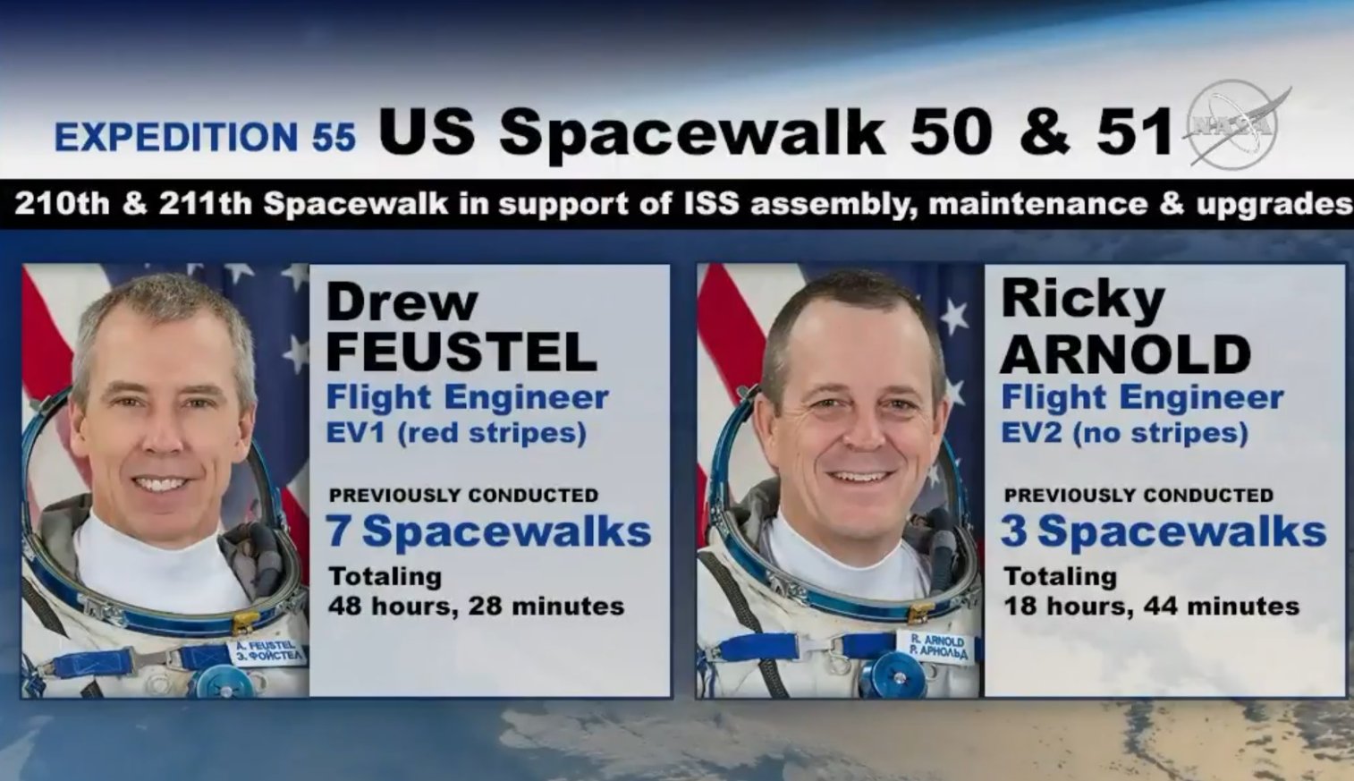 Dnes ve 14:10 našeho času by měl začít americký, šest a půl hodiny dlouhý výstup do volného prostoru, kterého se zúčastní Andrew Feustel (velitel výstupu – jeho skafandr bude mít červené proužky) a Richard Arnold (skafandr bez pruhů). Jejich prvním úkolem bude přesunout pumpu PFCS (Pump Flow Control Subassembly) z platformy pro náhradní díly k manipulátoru Dextre. Astronauti odstraní poškozenou pumpu PFCS, která se stará o cirkulaci čpavku ve vnějším chladicím okruhu. Pozemní operátoři pak s pomocí dálkového ovládání robotické paže Canadarm 2 a malé paže Dextre umístí náhradní díl na správné místo.