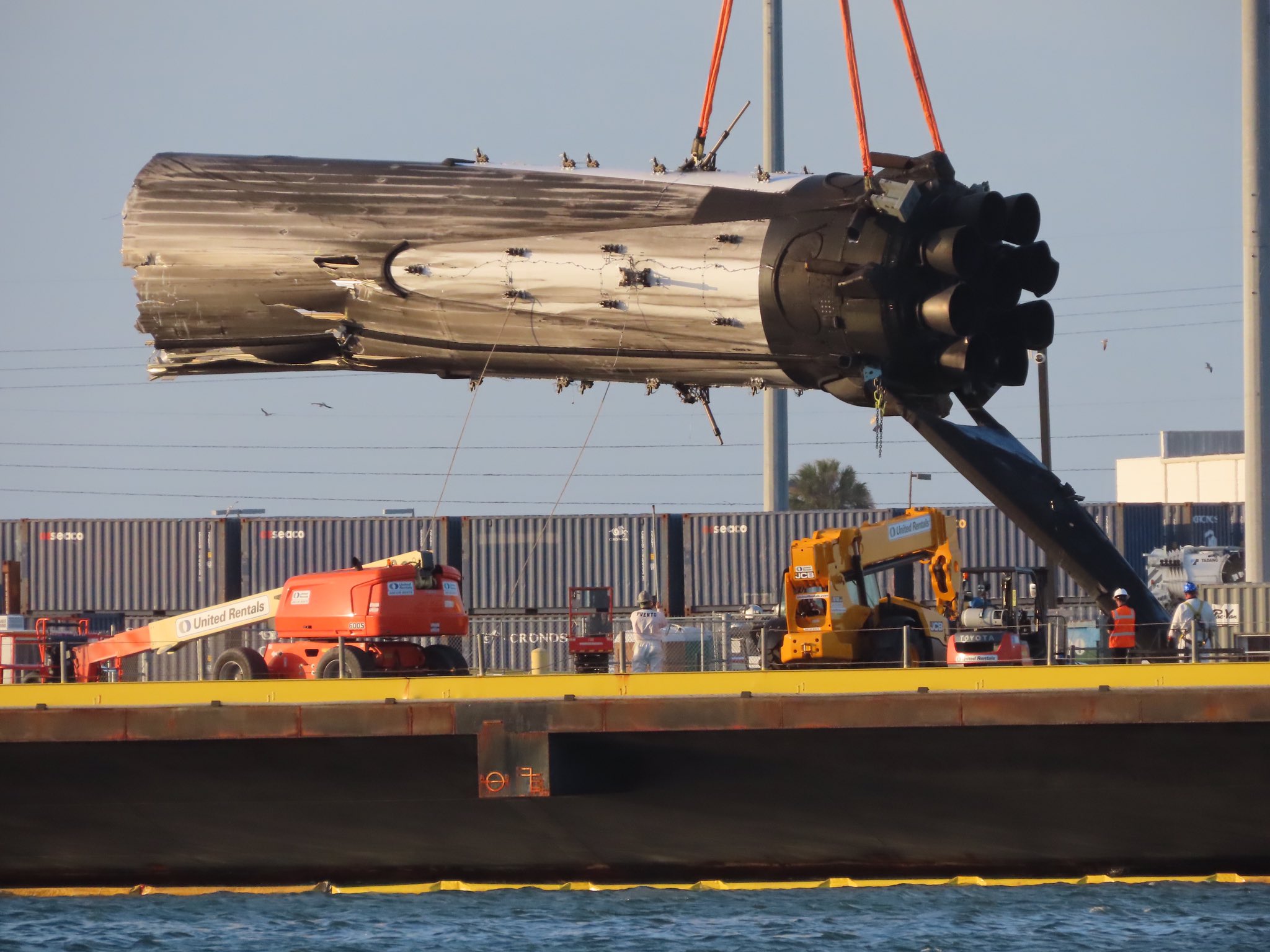 Centrální stupeň Falconu Heavy z mise Arabsat 6A se bohužel po úspěšném přistání na plovoucí plošině převrhl, protože s lodí zmítaly velké vlny. K jeho zajištění nebylo možné použít robota, který sice byl na palubě, ale spodní část centrálního stupně Falconu Heavy neumožňuje jeho připojení. To by se mělo při následujících letech upravit. Na fotografiích níže se můžete podívat, jak část stupně, která zůstala na palubě, vypadá. Poškozené jsou i motory Merlin 1D.