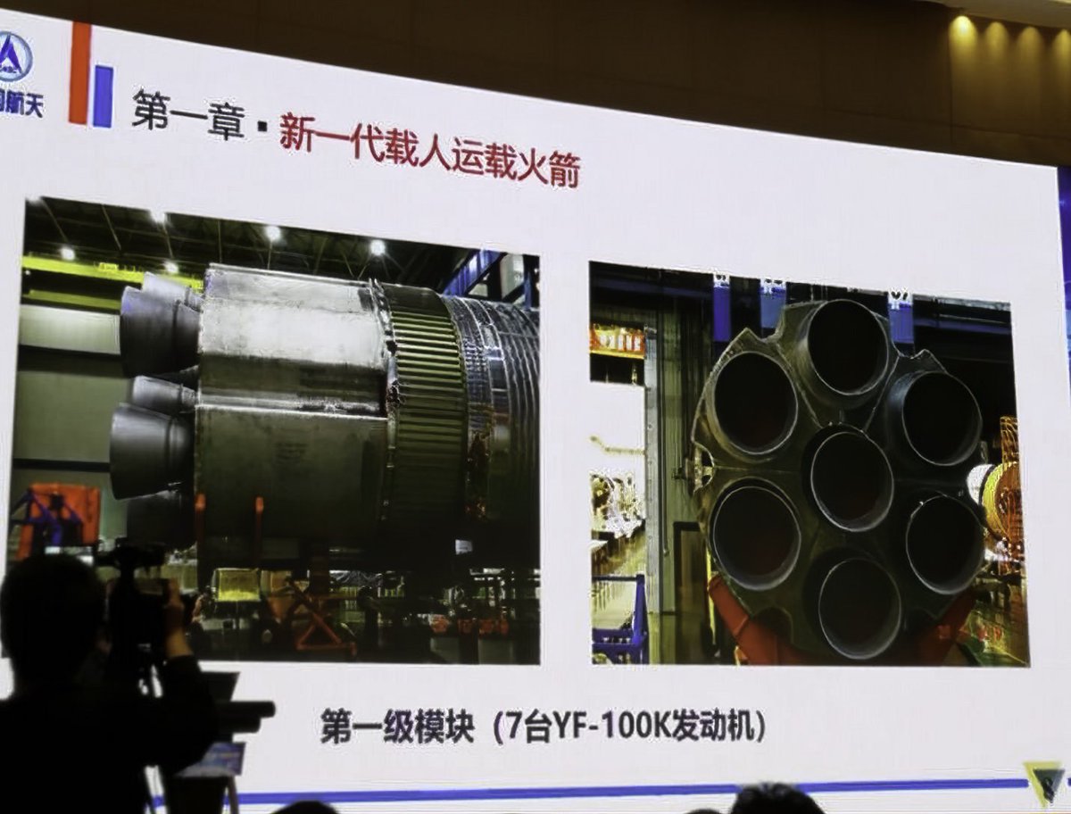 Hmotnost rakety je uvedena 2211 tun, tah 2680 tun, nosnost na nízkou oběžnou dráhu Země 70 tun a na přechodovou dráhu k Měsíci 27 tun. V každém ze tří bloků prvního stupně o průměru pět metrů je sedm motorů YF-100K, které jsou vylepšenou verzí současných motorů YF-100 na RP-1/LOX z prvního stupně současné rakety CZ-5. Ve druhém stupni jsou dva motory YF-100M, což je vakuová verze motoru YF-100K. Ve třetím stupni jsou tři motory YF-75D na LH2/LOX, v současnosti používané ve druhém stupni rakety CZ-5. V pravé části prezentace je znázorněna dvoustupňová verze rakety s pouze centrálním blokem prvního stupně pro pilotované lety kosmické lodi XZF-SC na nízkou oběžnou dráhu Země.