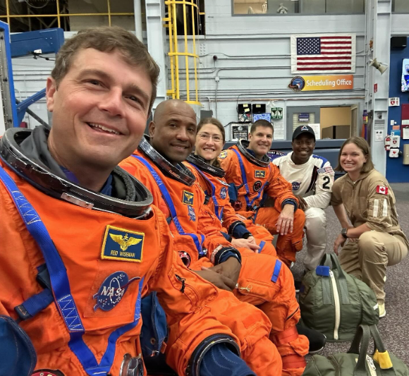 Letová a záložní posádka mise Artemis II. Zleva Reid Wiseman, Victor Glover, Christina Koch, Jeremy Hansen, Andre Douglas, Jenni Gibbons.