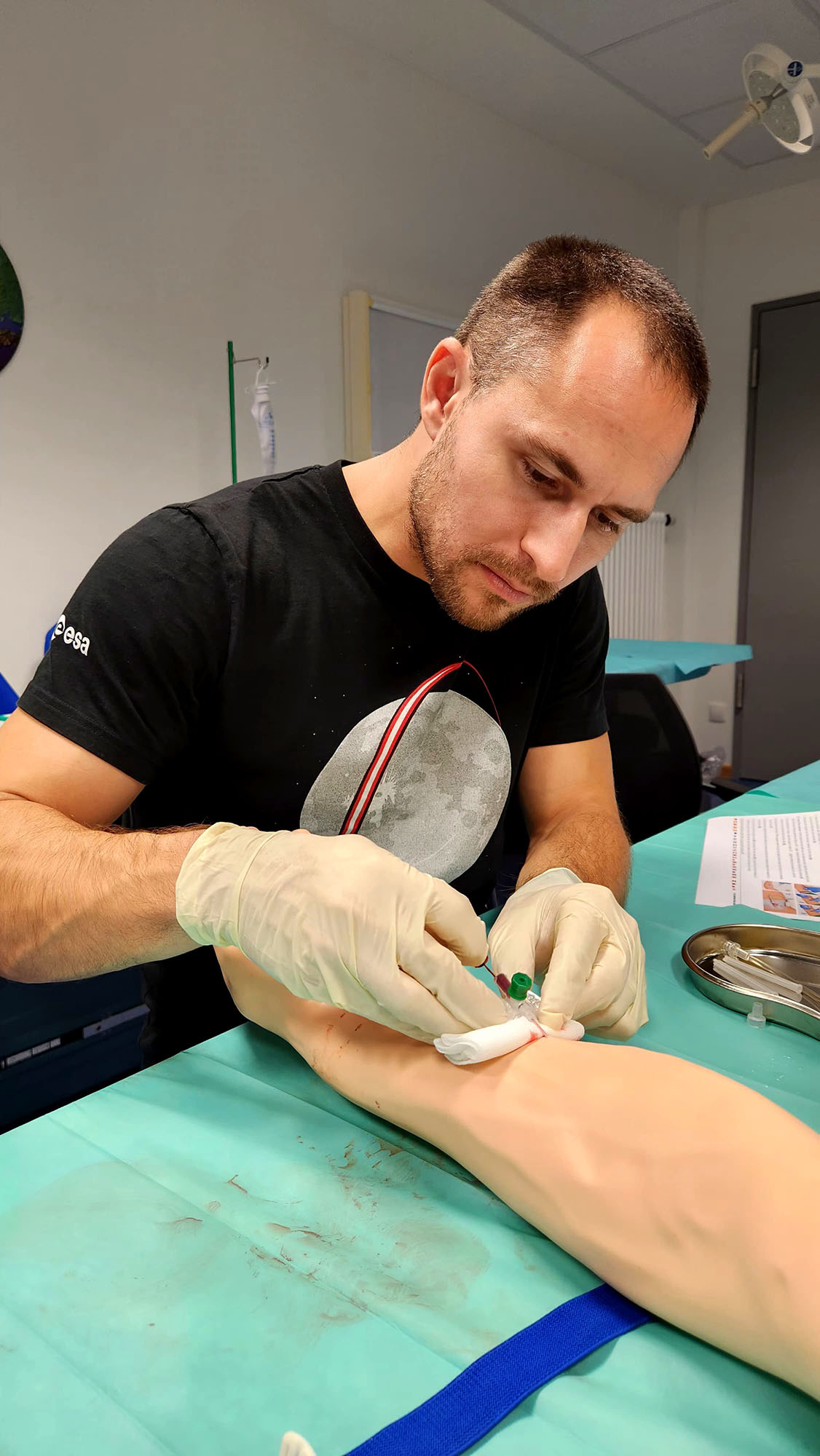 Odpoledne nás čekalo první praktické cvičení (nepočítáme-li ultrazvuky): kanylaceodběry. Cvičili jsme na figuríně se „živým“ cévním řečištěm a zásobníkem krve. Zavádění kanyly pro IV přístup není nic neobvyklého. Na orbitální stanici se dělá buď „jednoduchým“ způsobem prostě do žíly na předloktí, nebo za pomoci ultazvuku („ultrasoundguided“). Odebírání krve je pak taková odlehčená verze zavádění „IV line“. Každý člen posádky musí umět fungovat tak trochu jako medik.