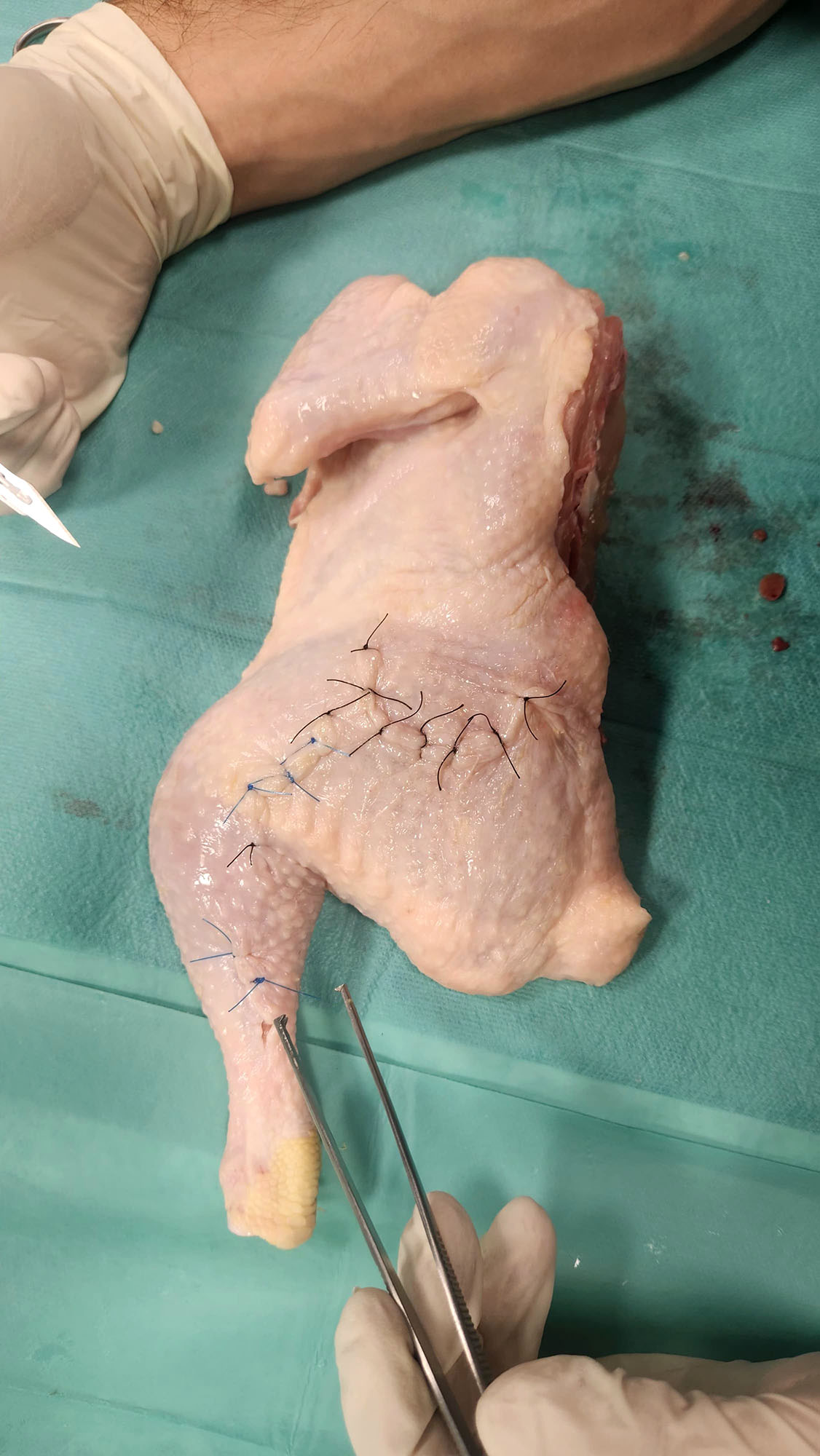 Dopoledne další praktikum: cévkováníšití. Zavádění močového katétru, které se trénuje naštěstí jen na figurínách. Poté základní šití (nylon, hedvábí), které jsme nacvičovali na kuřeti. Kuře to zvládlo statečně. Jedná se o základní dovednosti a postupy, které musí každý astronaut zvládnout, a které během orbitálních misí nejsou tak neobvyklé, jak by se mohlo zdát.