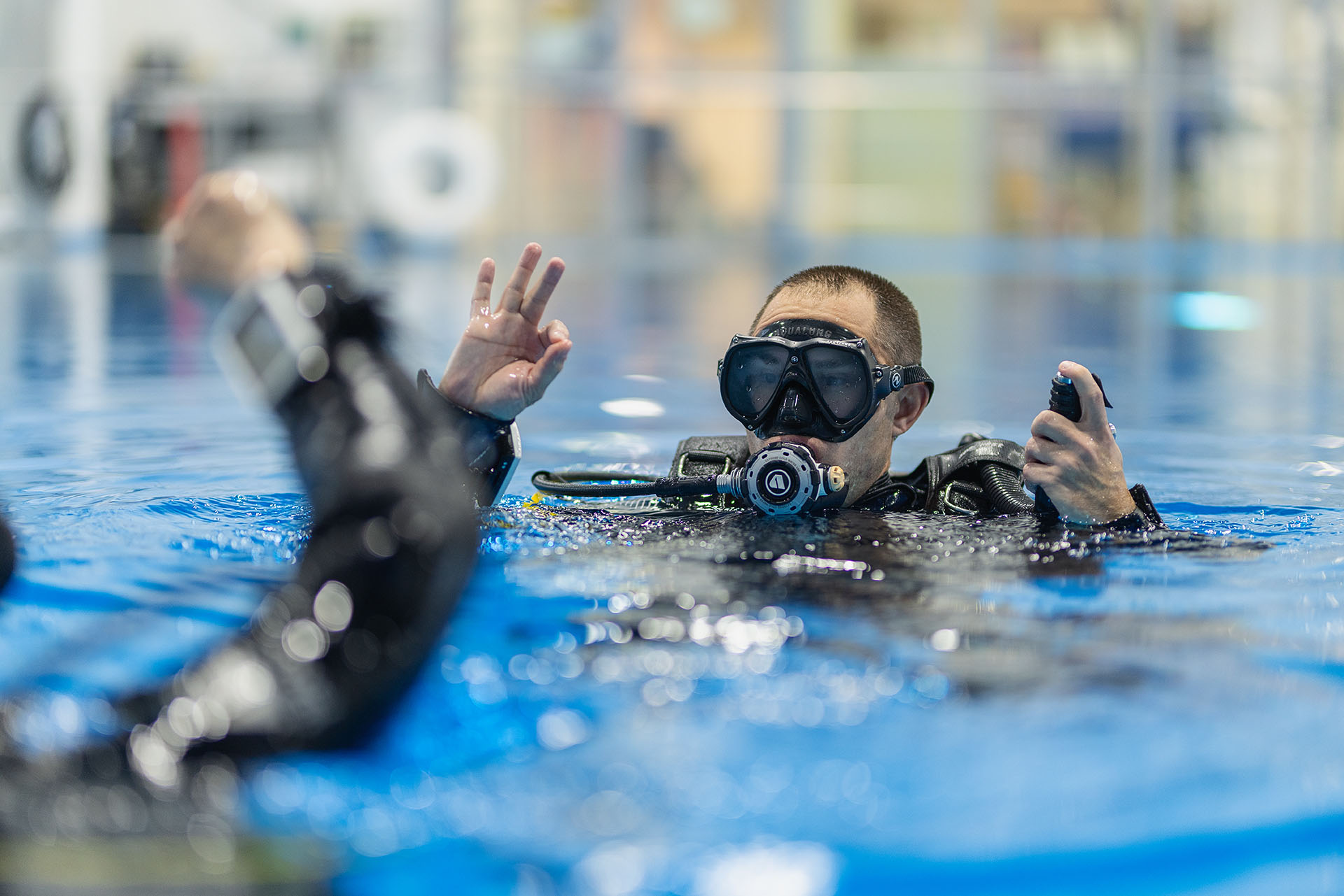 Odpoledne recertifikace v NBF bazénu. Každoroční přezkoušení základních potápěčských dovedností v NBF (Neutral Buoyancy Facility). Udržujeme si tak kvalifikaci pro potápění v bazénech NBF i NBL (to je ten větší, v Houstonu). Další část výcviku v bazénu, zaměřená na prohloubení dovedností pro výstupy do volného kosmického prostoru, nás totiž čeká příští rok na jaře.