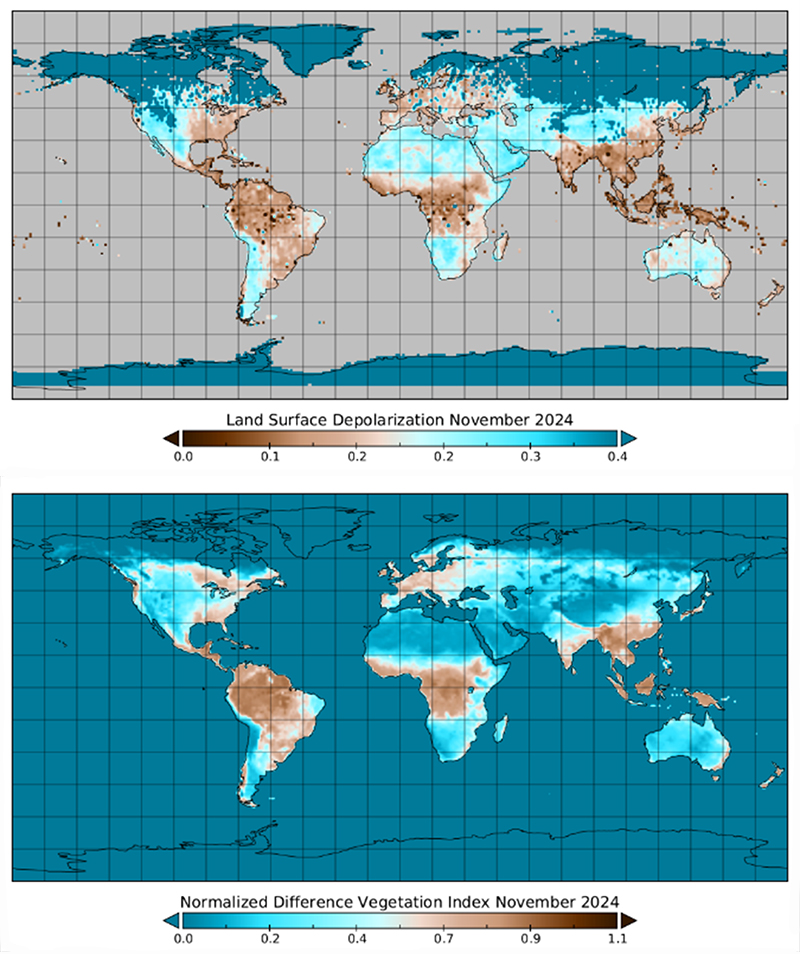 Pokud bychom se zaměřili na hodnoty depolarizace nad pevninou (0 – 0,4), můžeme vidět, že oblasti s velkými deštnými pralesy (jako je Jižní Amerika, Kongo, či jihovýchodní Asie) mají poměrně nízké hodnoty depolarizace, zatímco pouště a stepi vykazují relativně vysoké hodnoty depolarizace (světle modrá). Tento vzor je potvrzen při porovnání s indexem normalizovaných rozdílů vegetace NDVI (Normalised Difference Vegetation Index), který měří zelenost vegetace s využitím rozdílů mezi blízkým infračerveným zářením (které je vegetací silně odráženo) a červeným světlem (které vegetace pohlcuje). Vysoké hodnoty NDVI značí hustou, zdravou vegetaci, zatímco nízké hodnoty NDVI značí holou půdu, či vodní plochu a řídkou vegetaci. Na dalším obrázku jsou nahoře zobrazeny údaje o povrchové depolarizaci z ATLID a níže vidíme index NDVI odvozený z přístroje MODIS (Moderate Resolution Imaging Spectroradiometer) nadružici Aqua z listopadu 2024. Povšimněte si, že barevná škála NDVI je obrácená, aby odrážela antikorelaci s hodnotami depolarizace.