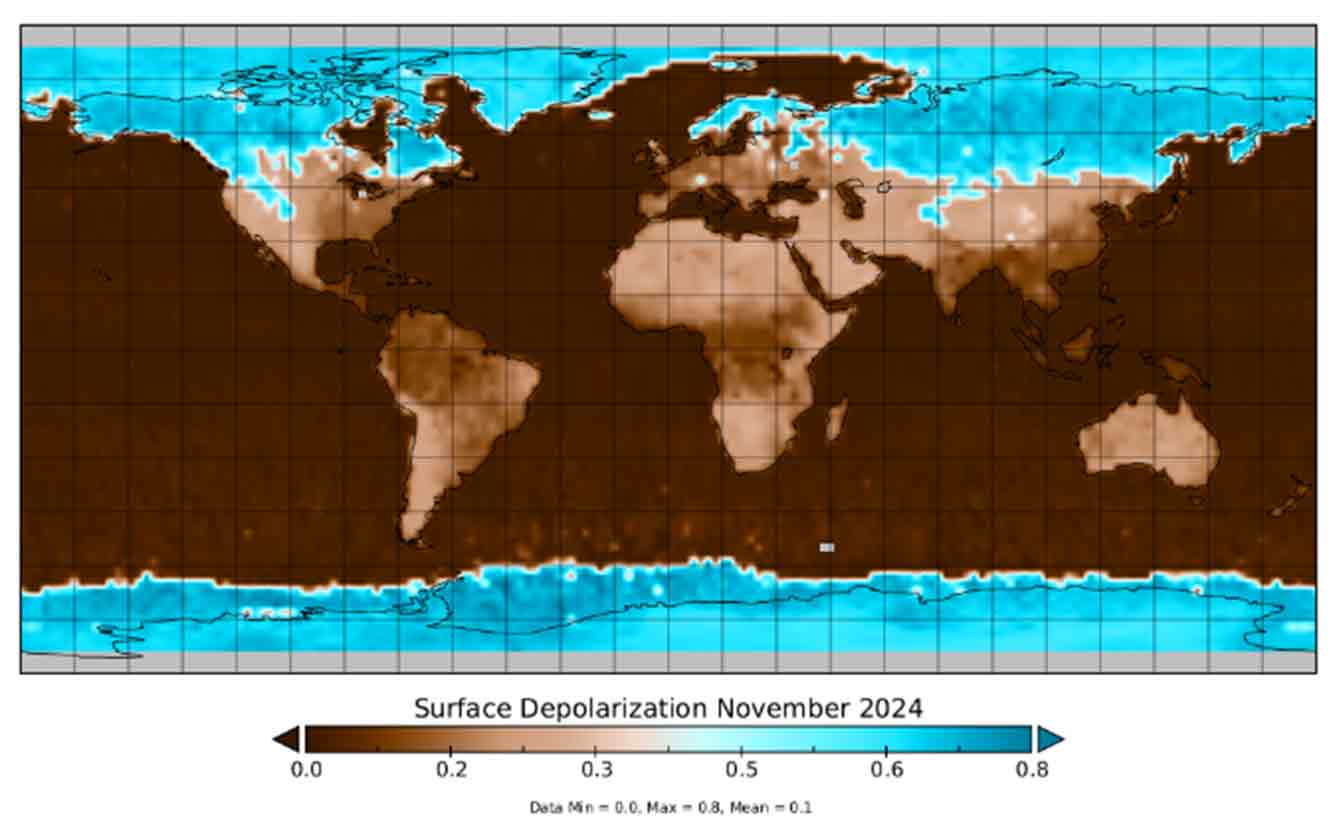 Jak ale EarthCARE rozlišuje jednotlivé povrchy? Poměr mezi křížově a souběžně polarizovanými částicovými signály se označuje jako depolarizační poměr. Tato hodnota ukazuje, jak moc je odražené laserové záření rozmíchané a rozhozené. Nízké hodnoty znamenají, že polarizace světla zůstala z většiny nezměněná, což bývá typické pro vodní hladinu bez vln. Střední hodnoty indikují odraz od hrubějšího terénu, zatímco vysoké hodnoty naznačují povrchy jako je sníh, či led (včetně mořského). Tím je umožněno hladké odlišení oceánu, pevniny, ledu a sněhu. Na přiloženém obrázku je vyobrazena depolarizace v listopadu 2024. Vidíme zde vysoké hodnoty depolarizace způsobené sněhem a ledem (modře) ve vztahu ke středním hodnotám nad pevninami a tmavě hnědými hodnotami v oceánu.