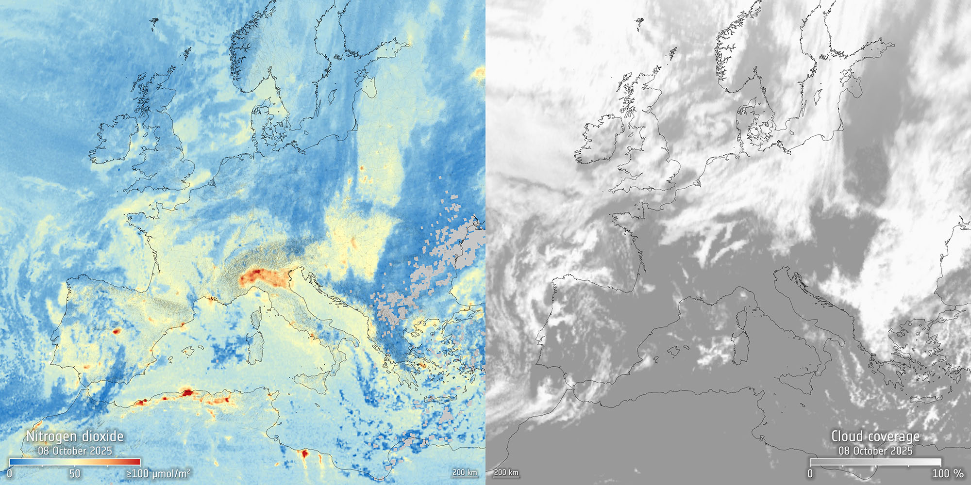 Na prvním snímku vidíme data o troposférickém oxidu dusičitém s jasnými místy jeho zvýšené koncentrace. Tyto lokality jsou vidět především podél pobřeží Středozemního moře a v údolí řeky Pád. Sluší se poznamenat, že Sentinel-4 nemůže měřit koncentrace oxidu dusičitého nad oblastmi, které jsou zakryté oblačností. Právě to je důvod, proč na přiloženém obrázku nejsou nad některými oblastmi dostupné údaje. Obrázek vpravo ukazuje, jak vypadala oblačnost v době měření.