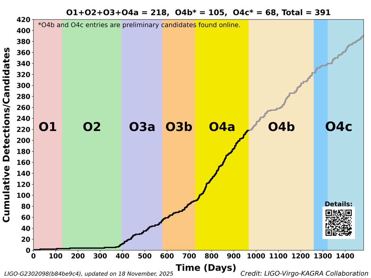 Od té doby se mnoho změnilo. Čtvrtý běh pozorování O4 začal 24. 5. 2023 a ke dni psaní článku (15. 11.) stále probíhá, má skončit 18. 11. 2025. Tento běh je nezvykle dlouhý, proto byl rozdělen do tří podkategorií, běhů O4a (květen 2023–leden 2024), O4b (duben 2024–leden 2025) a O4c (leden 2025–listopad 2025). Kandidátských událostí máme už máme několik stovek, takže nemá smysl je probírat podrobněji, až na některé výjimky, k nimž se dostaneme později.