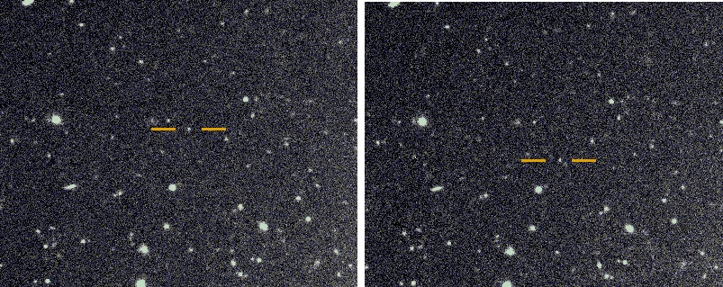 Snímek nedávno objeveného malého měsíce planety Saturn. O objev se zasloužil „Plutokiller“ Scott Sheppard, který použil dalekohled Subaru na Havajských ostrovech.