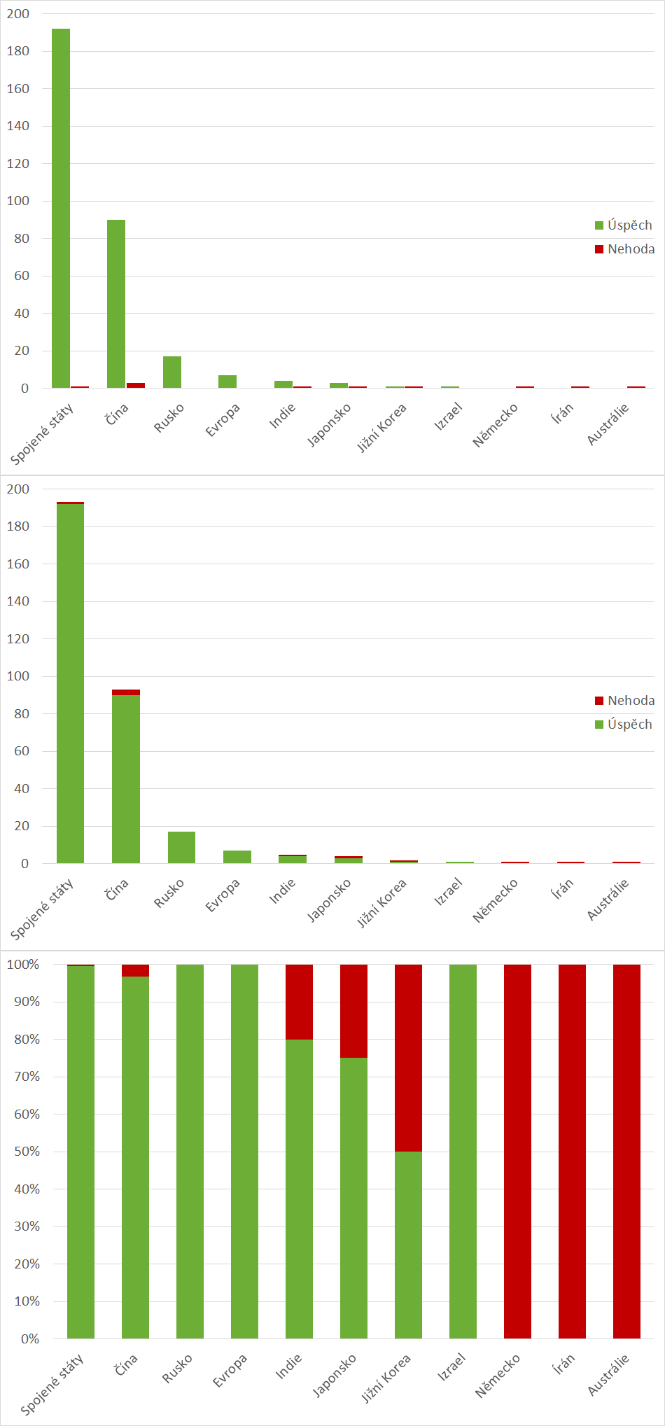 U předchozích odstavců vidíme tři grafy, které vizualizují stejná data – počty pokusů o dosažení oběžné dráhy v roce 2025 podle států. Zatímco první graf se lépe hodí pro srovnávání absolutních hodnot úspěšných, neúspěšných a částečně úspěšných startů jednotlivých států, druhý je vhodnější pro porovnání celkové aktivity států, protože všechny starty daného státu jsou sloučeny do jednoho sloupce. Třetí graf pak přehledně ukazuje relativní spolehlivost startů raket z daného státu.