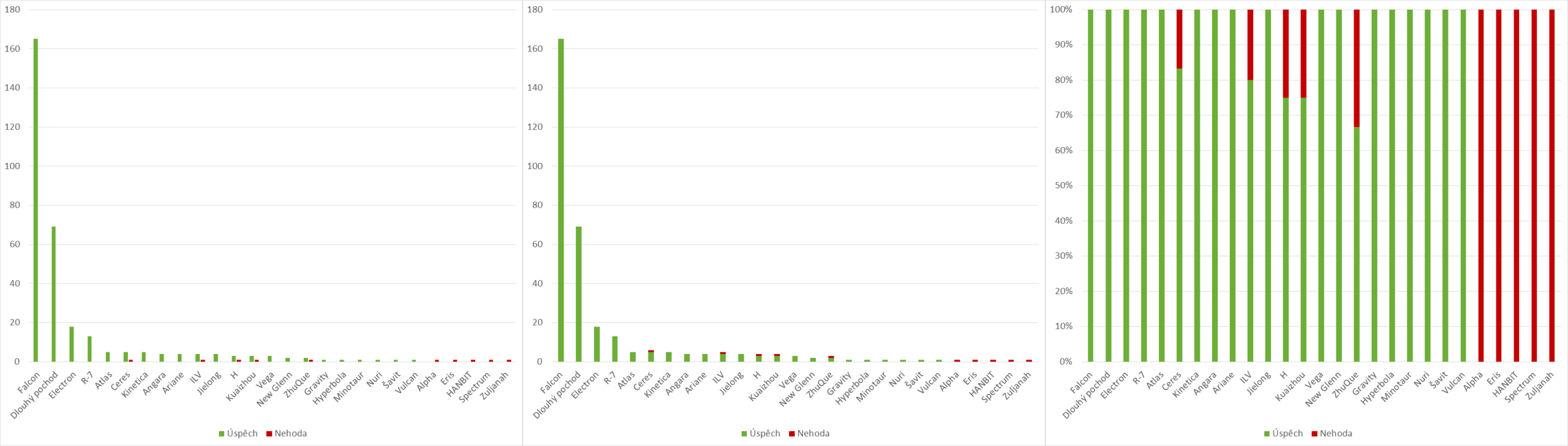 Když jsme si zrekapitulovali statistiky jednotlivých států, můžeme se nyní zaměřit na jednotlivé rodiny nosných raket. Asi nikoho nepřekvapí, že této rubrice opět dominuje rodina Falcon, která si v roce 2025 připsala výše zmíněných úctyhodných 165 startů, tedy o 31 více než v roce 2024, přičemž ani jeden z nich není hodnocen jako havárie. Druhé místo patří rodině Dlouhý pochod, která v roce 2025 startovala 69krát a rovněž ani jednou neselhala. Třetí příčku obsadila rodina raket Electron s 18 starty a 18 úspěchy. Následují rodiny R-7 (13 startů, všechny úspěšné), Ceres (6 startů, 1 nehoda), Atlas (5 startů, žádná nehoda), Kinetica (5 startů, žádná nehoda), ILV (5 startů, 1 nehoda), Angara, Ariane a Jielong (4 starty, žádná nehoda), dále H a Kuaizhou (4 starty, 1 nehoda), Vega (3 starty, žádná nehoda), ZhuQue (3 starty, 1 nehoda), New Glenn (2 starty, žádná nehoda), Gravity, Hyperbola, Minotaur, Nuri, Šavit a Vulcan (1 start, žádná nehoda). Na konci pořadí bychom našli rodiny Eris, HANBIT, Spectrum a Zuljanah (1 start, 1 havárie).
