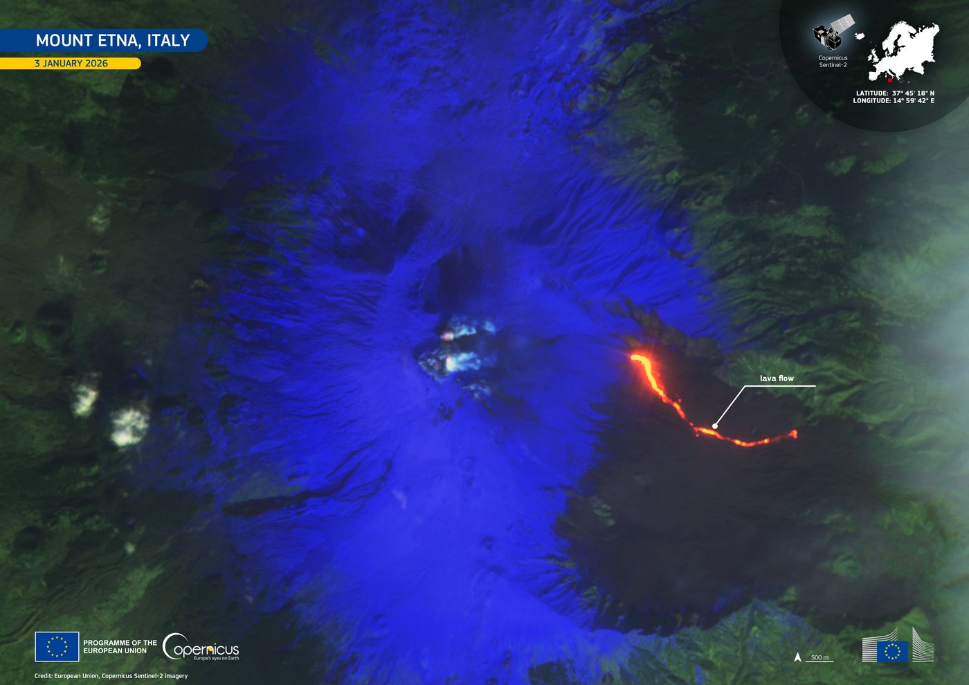 Krásně děsivý snímek zajistila družice z evropské flotily programu Copernicus. 1. ledna 2026 vstoupila Etna do nového roku novou erupcí, kdy se láva objevila u trhliny, která se nachází přibližně 2 000 až 2 100 metrů nad mořem ve Valle del Bove. Podle italského Národního institutu geofyziky a vulkanologie (INGVvulcani), nebyly zasaženy žádné obytné oblasti a nejsou hlášeny ani žádné škody. Tento snímek ve falešných barvách, pořídil 4. ledna 2026 Sentinel-2 – jedna z družic evropského programu Copernicus. Ukazuje zasněžené oblasti v modré barvě, zatímco aktivní tok lávy je červený a dobře vidět. Data z družice Sentinel-2 hrají klíčovou roli při sledování erupce a umožňují rychlou identifikaci lávových cest, tepelných anomálií a změn v sopečné krajině. Tyto služby samozřejmě využívají i místní úřady.