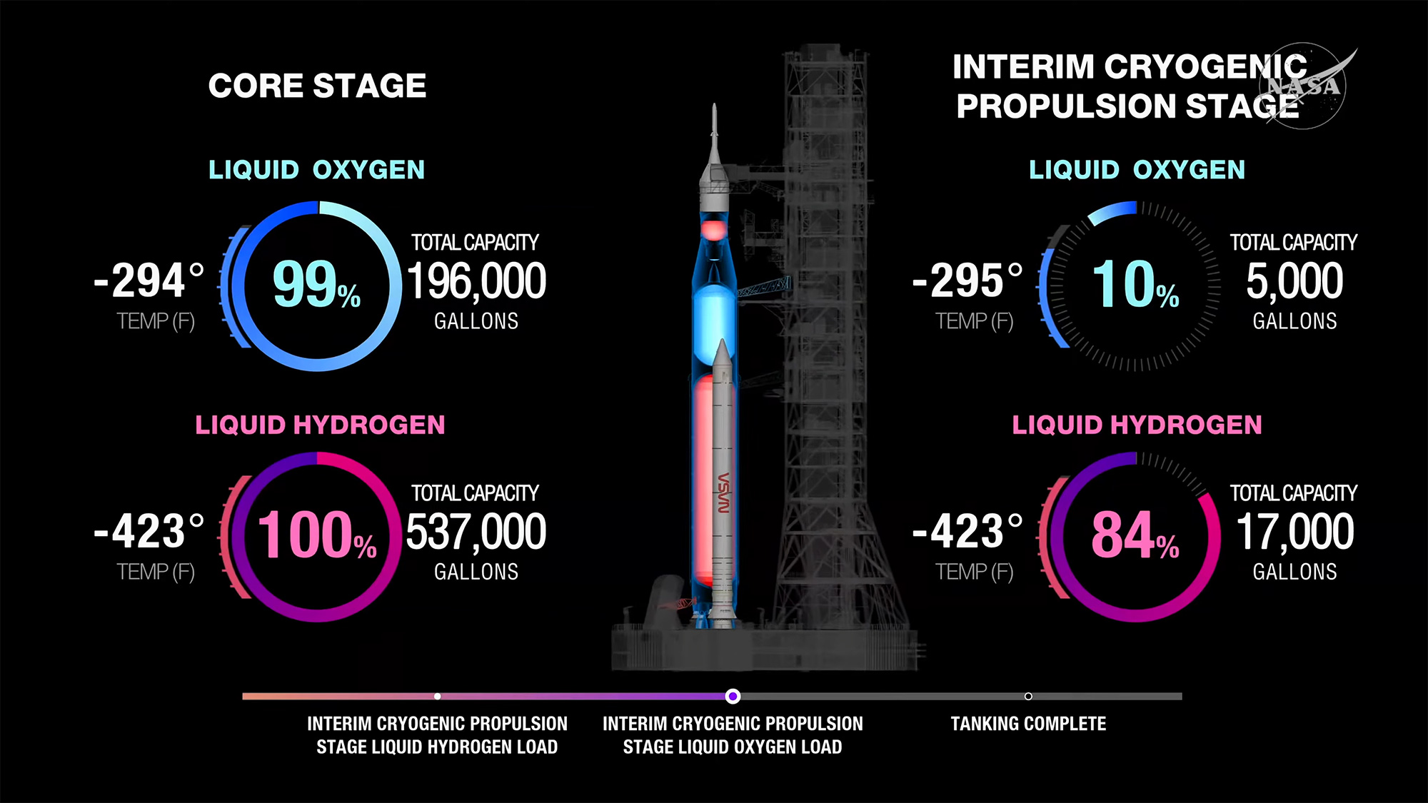 Plnění centrálního stupně rakety SLS kapalným kyslíkem pokračuje v rychlém režimu. Rychlé plnění kapalným vodíkem je zatím odloženo, protože týmy řeší potíže s pozemním komunikačním systémem.