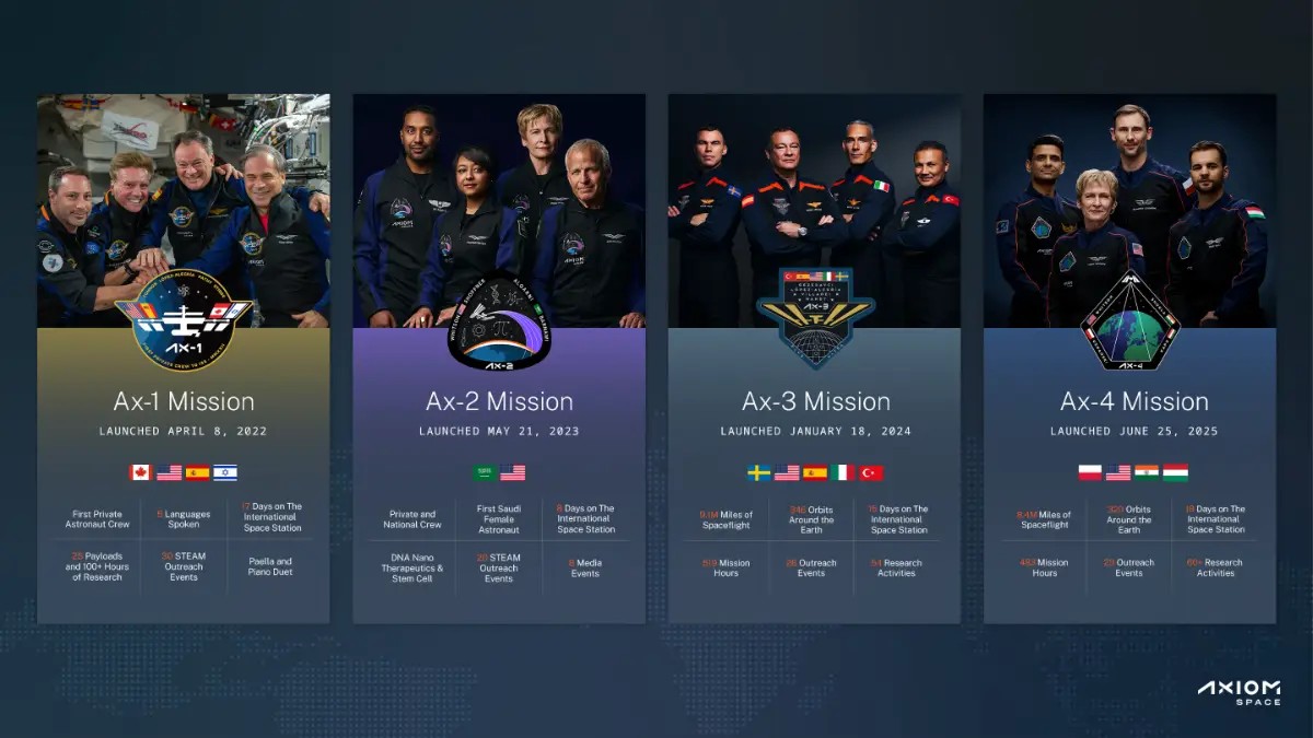 Dodejme ještě, že během čtyř let společnost Axiom úspěšně provedla čtyři pilotované mise na ISS, přičemž přepravila 14 soukromých a vládních astronautů, kteří během pobytu na oběžné dráze provedli více než 160 vědeckých a výzkumných aktivit a více než 100 informačních a mediálních setkání. Předchozí mise Axiom Space vedli astronauti NASA ve výslužbě Michael López-Alegría, hlavní astronaut Axiom Space, a Peggy Whitson, viceprezidentka Axiom Space pro pilotované lety. Tyto mise dosáhly mnoha prvenství, včetně první saúdskoarabské astronautky a prvního tureckého astronauta, kteří se dostali do kosmického prostoru, a poprvé na palubě ISS žili a pracovali astronauti ze Saúdské Arábie, Turecka, Indie, Polska a Maďarska.