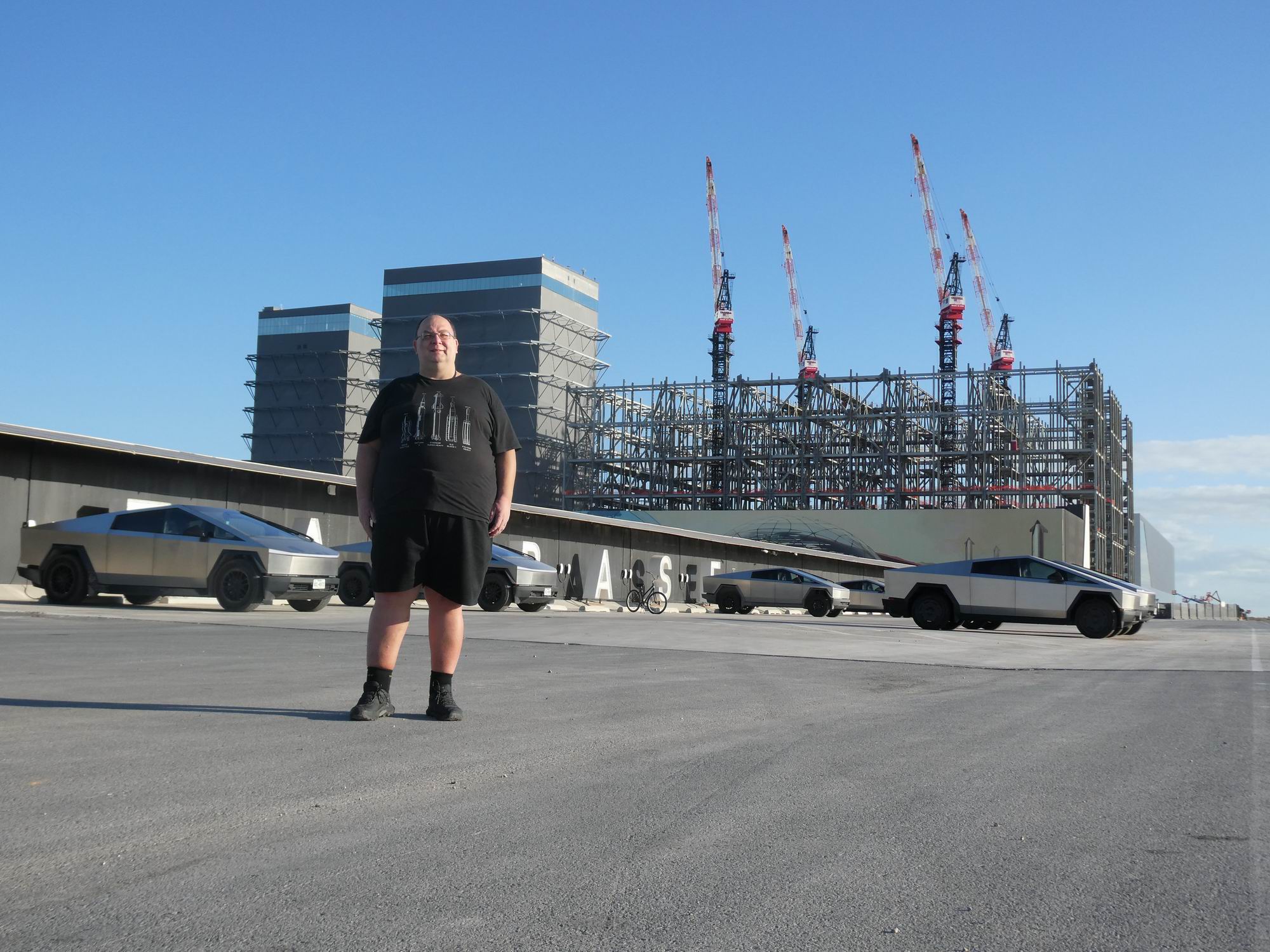 Hned na první pohled při příjezdu na Starbase zaujme obří parkoviště Cybertrucků (resp. jiná vozidla tam mají zakázaný vjezd). Bylo jich tam požehnaně (a to jsme na základně byli o víkendu). Ovšem mnohem důležitější je rostoucí budova Gigabay, která má být o něco větší než ta na Floridě (výška 146 m, půdorys 91 krát 113 m) a v níž se bude souběžně připravovat 24 raket Starship.