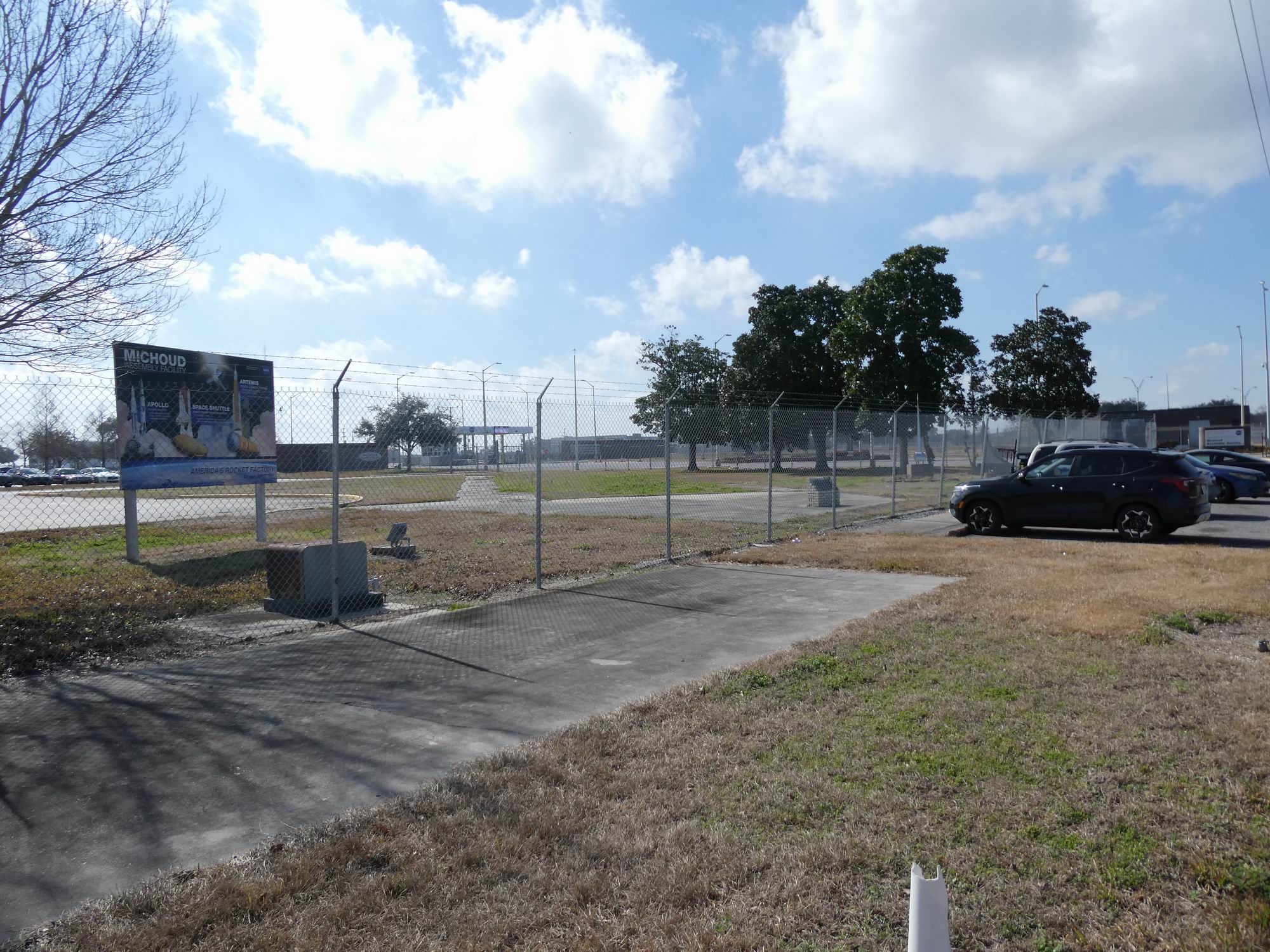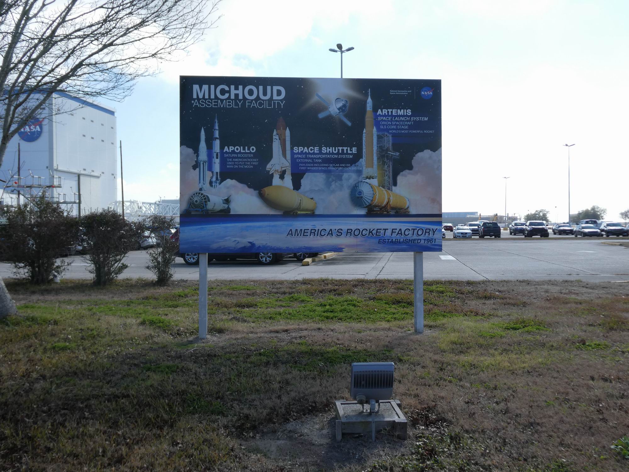 Loučíme se Starbase a zahajujeme návrat zpět na Floridu. Na cestu se vydáváme v neděli 8. února před polednem s tím, že je to cca 2200 km, takže plánujeme dorazit do cíle v úterý 10. února před polednem. (Jedeme s jedním řidičem, který to odtáhl i sem…) Aby nám cesta lépe ubíhala, zastavujeme se v pondělí 9. února u továrny Michoud Assembly Facility. Jde o továrnu, která vznikla v době druhé světové války, ale rozkvětu se dočkala s rozvojem programu Apollo. Tehdy se zde rozjela sériová výroba prvního stupně S-IC rakety Saturn V. Letových exemplářů zde vzniklo patnáct (použito nakonec bylo třináct) plus několik kusů ověřovacích. Pak sem přišla výroba vnějších nádrží ET (External Tank) pro kosmické raketoplány Space Shuttle, později se tu počítalo s výrobou prvního a druhého stupně rakety Ares V. K tomu nakonec nedošlo. Dnes se zde vyrábí první stupně SLS (Space Launch System) pro program Artemis.