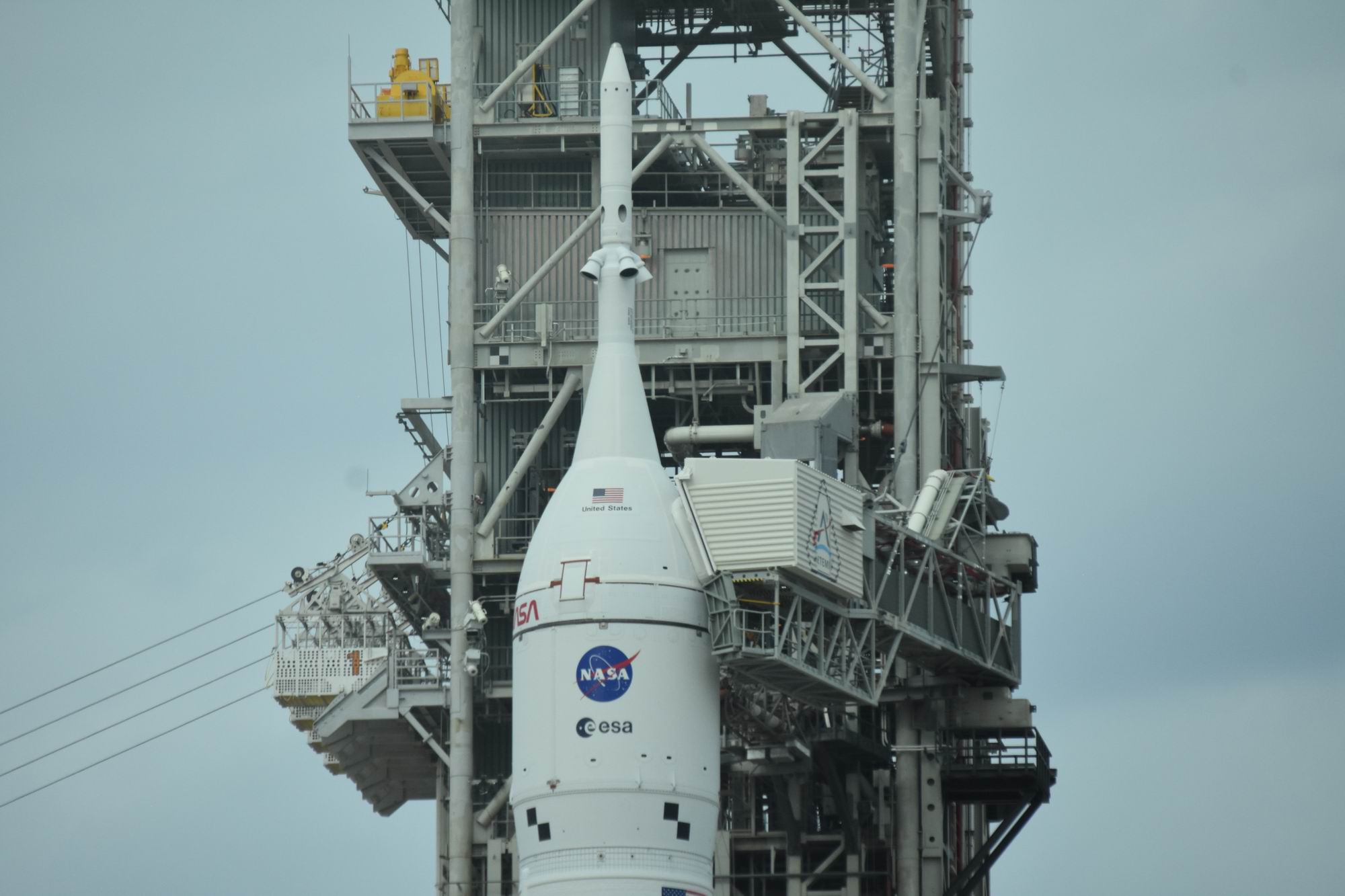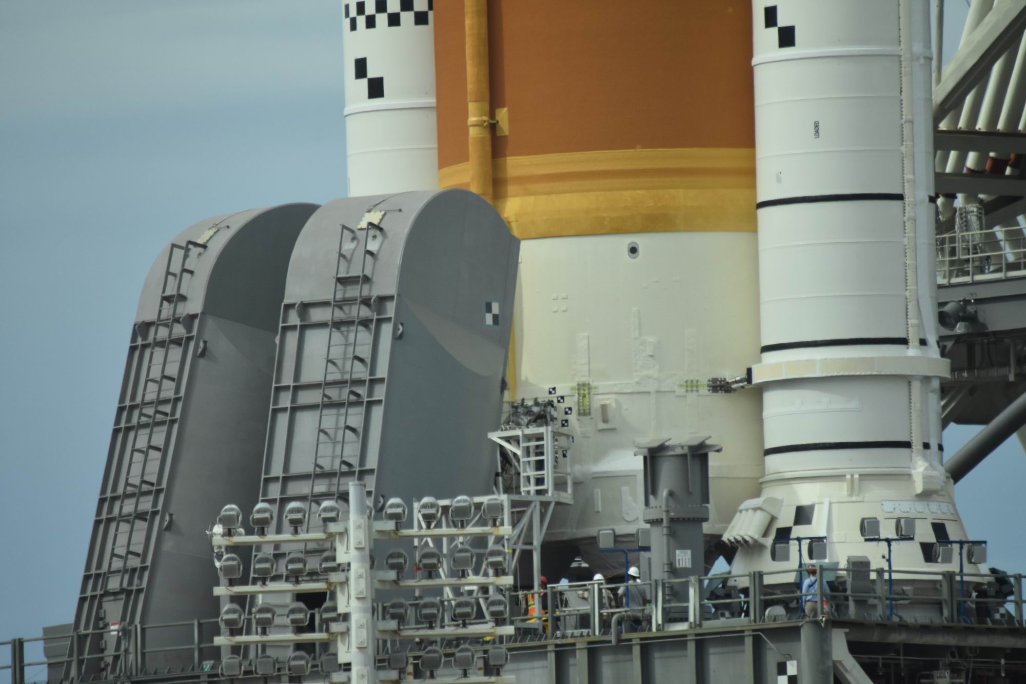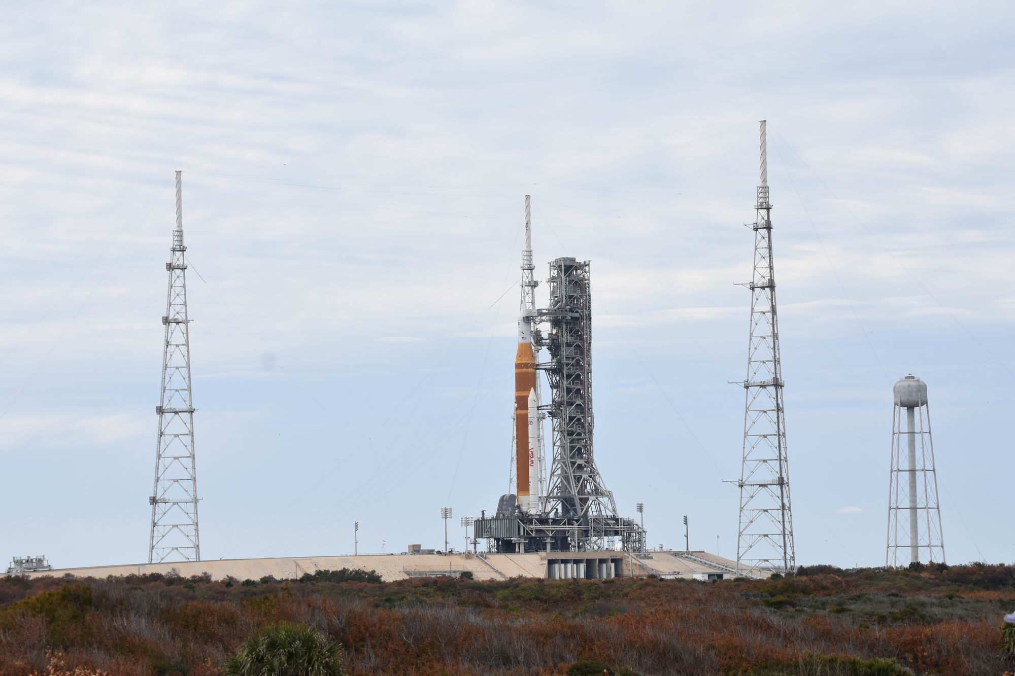 Druhou zastávkou bylo místo A/B Observation Mound: je na půli cesty mezi rampami 39A a 39B a při startech jsou zde vysokorychlostní kamery. Obě rampy jsou odtud solidně vidět, takže jde o perfektní místo k focení. Následovala asi nejzajímavější část trasy. Sice bez opuštění autobusu, ale k perimetru rampy 39B, na níž je aktuálně SLS. To je nějakých 450 m k raketě vysoké téměř sto metrů. Dechberoucí zážitek, na raketě je vidět prakticky každý šroubek!