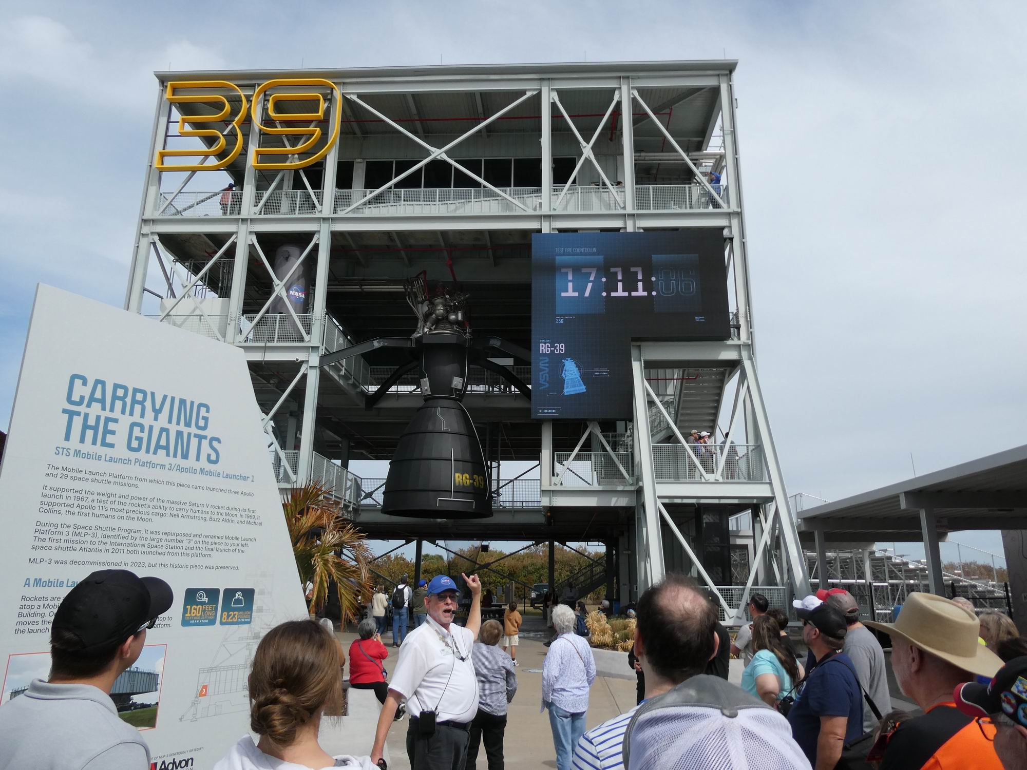 První zastávka na naší KSC Explore Tour byla čtyřpatrová vyhlídková věž LC-39 Gantry. Stojí v místě, kde se „dálnice“ crawlerway pro dopravu obrů rozděluje na větev k rampě 39A a 39B. Krom záchodků, krámku se suvenýry a automatů s občerstvením nabízí především výhled na obě části kosmodromu: na Kennedyho kosmické středisko i na mys Canaveral. Vzdálenosti jsou zde značné (startovací rampy musí mít dostatečný prostor, kdyby se „něco“ stalo), ale i tak jde o vynikající místo k přehlédnutí celého areálu. My navíc měli (jak už jsme ve výše uvedeném díle seriálu psali) kliku, že na třech rampách stály tři velké rakety. SLS pro misi Artemis II na 39B, Vulcan na SLC-41 a Falcon 9 s lodí Dragon Freedom na SLC-40. Takže bylo nač koukat.