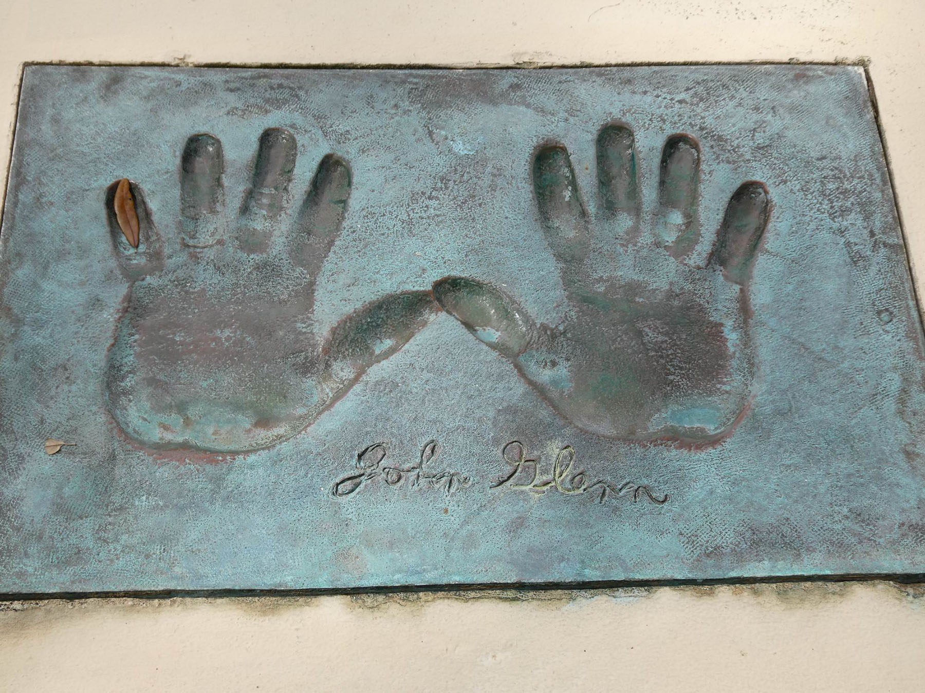 Nejzajímavější částí parku jsou z pohledu běžného návštěvníka bronzové odlitky otisků rukou jednotlivých astronautů. Tedy alespoň těch, kteří žili dostatečně dlouho, aby mohli otcům zakladatelům pomníků své ruce k vytvoření odlitků poskytnout. A tak je třeba u Mercury šest otisků rukou ze sedmi (z pochopitelných důvodů chybí Gus Grissom). U Gemini to bylo podobné, ale během naší návštěvy v minulých dnech zde byla jedna jediná bronzová deska Eugena Cernana. Ostatní byly dočasně odstraněny v rámci probíhající renovace. U Apolla je zajímavé, že zde najdeme ruce obou sovětských kosmonautů (Alexej Leonov a Valerij Kubasov), kteří se zúčastnili mise Sojuz-Apollo. U raketoplánů se otisky rukou neplánují: stovky desek (a dnes už desítky chybějícího) by z parku udělaly spíše bronzový val, než důstojné místo připomínající historii amerického kosmického výzkumu.