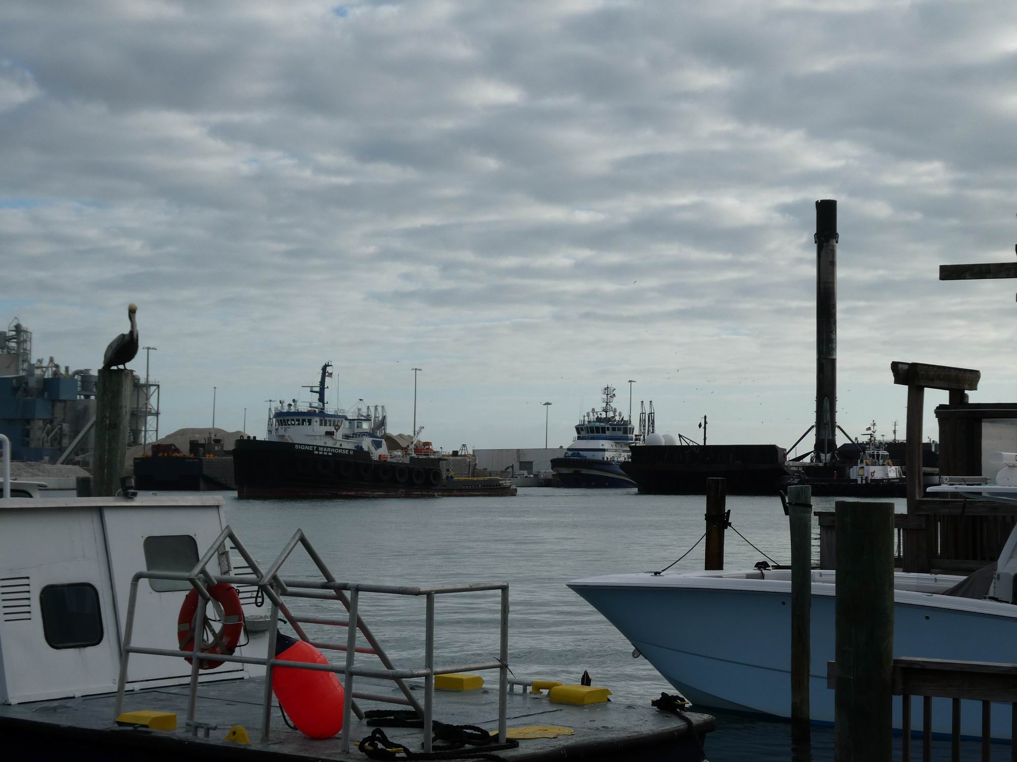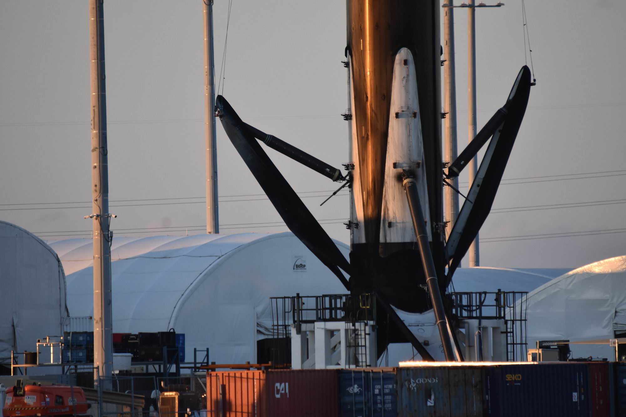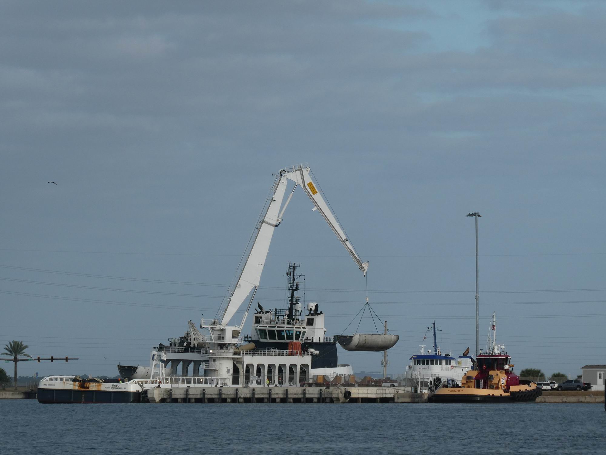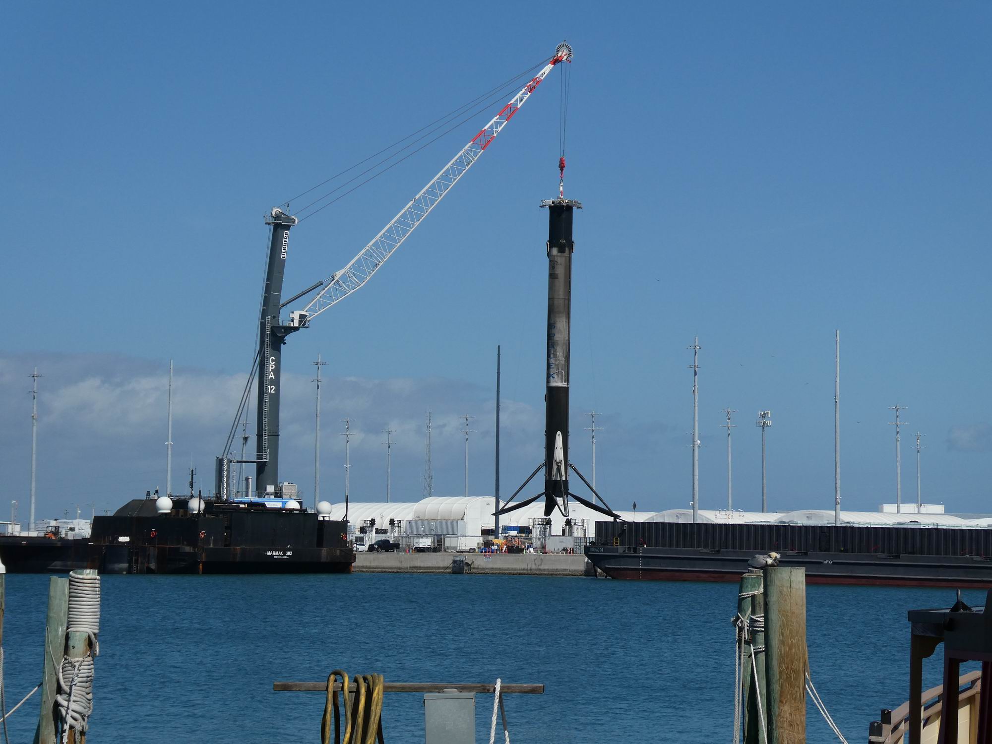 Všechna tato plavidla je ovšem možné vidět v provozu: jak přiváží a vykládají použité stupně Falconů 9 nebo aerodynamické kryty a následně vyráží zpět na moře pro novou porci nákladu. Přístav s oblibou navštěvujeme opakovaně, protože tady se (slovy klasika) „furt něco děje“. (Kdysi jsme tu viděli dva stupně, ale prý se tu občas při zvýšeném provozu potkaly i tři.) Jednou jsme během naší aktuální návštěvy byli svědky skládání podvozkových nohou stupně B1095, podruhé jsme tu strávili celé dopoledne. To když po úspěšném desátém letu dorazil stupeň B1090 a během několika málo hodin byl jeřábem přeložený na pevninu. Plošina ASOG se totiž potřebovala rychle vrátit na moře, aby poskytla útočiště další startující raketě. A abychom se nenudili, hned vedle loď Doug vykládala dvě poloviny aerodynamických krytů ze stejné mise.