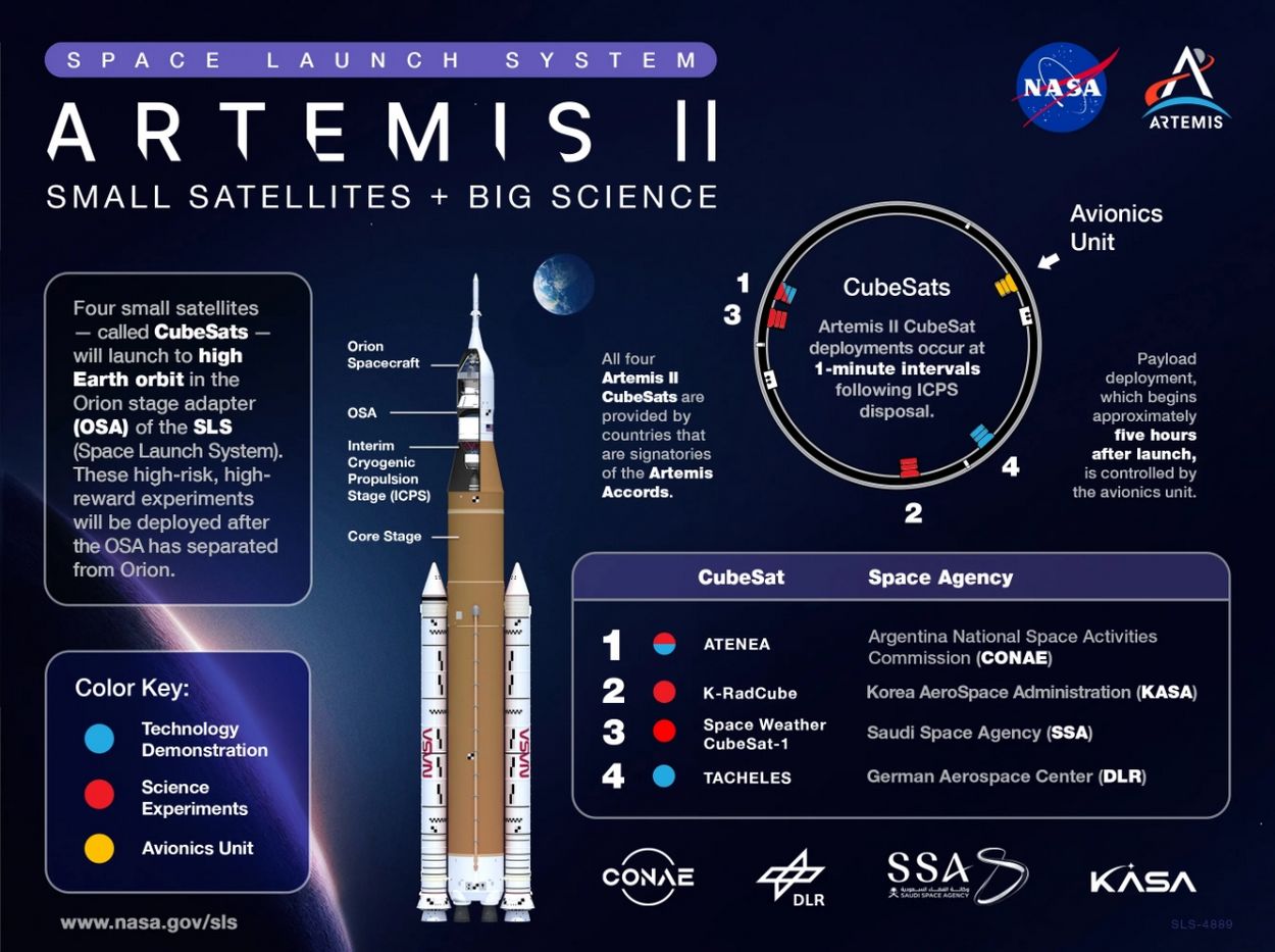 Nedílnou součástí mise Artemis II jsou také CubeSaty, které startovaly uložené ve spojovacím prstenci stupně ICPS a lodi Orion. Čtyři CubeSaty byly úspěšně vypuštěny poté, co se loď Orion dostatečně vzdálila od stupně ICPS. Prvním CubeSatem bylo argentinské zařízení s názvem ATENEA. Družice byla vyvinuta ve spolupráci s argentinským národním kosmickým programem. Dále ve spolupráci s univerzitou La Plata, univerzitou v Buenos Aires, CNEA, univerzitou San Martin a argentinským institutem radioastronomie. Družice bude obíhat po eliptické dráze kolem Země s nejvyšším bodem ve výšce až 72 000 km a bude sledovat vliv zvýšené radiace na zařízení CubeSatu a různé úrovně stínění těchto záření. Družice slouží také jako cvičný projekt pro řadu inženýrů, kteří na ní získávali zkušenosti se stavbou podobně náročného projektu a má stát na počátku náročnějších argentinských kosmických misí. Mimo jiné se na palubě také testuje příjem GPS z takto nezvyklé pozice a systémy komunikace z cislunárního prostoru. Stejně jako zbývající tři CubeSaty, má i tento rozměry 12U CubeSatu. Dalším CubeSatem je jihokorejský K-RadCube s podobným zaměřením. Tato mise představuje první korejský CubeSat, který byl vypuštěn ve spojení s lunární pilotovanou výpravou, a jeho cílem je získat základní data pro hodnocení radiačního rizika během budoucích pilotovaných výprav k Měsíci i dále. K-RadCube bude operovat v širokém rozsahu výšky oběžné dráhy, od přibližně 200 km až po přibližně 70 000 km, a bude přímo detekovat vysokoenergetické částice v různých radiačních prostředích, včetně oblastí uvnitř i vně Van Allenových radiačních pásů. Další družicí je saudskoarabská mise Space Weather CubeSat-1. Účelem mise je studovat jevy kosmického počasí ve vzdálenostech za nízkou oběžnou dráhou Země. Měření mají zlepšit pochopení kosmického prostředí ovlivněného sluneční aktivitou, včetně podmínek, které mohou ovlivnit systémy a komunikaci kosmických lodí. Očekává se, že data shromážděná během mise doplní stávající pozorování kosmického počasí z misí blízko Země. Posledním nákladem byl německý CubeSat Tacheles postavený firmou Neurospace. CubeSat nese mikrokontroléry budoucího roveru umístěné na třech deskách pro detekci efektů jednotlivých událostí kosmického počasí, s další stíněnou deskou a radiačními senzory. Užitečný náklad integruje elektroniku z roveru HiveR, která projde Van Allenovými radiačními pásy. Shromážděná data poskytnou vhled do radiačního prostředí a pomohou optimalizovat elektroniku roveru pro budoucí lunární mise. Mimochodem, připravovaný rover má podobu 3U CubeSatu s připojenými kolečky. Informace o něm naleznete zde.