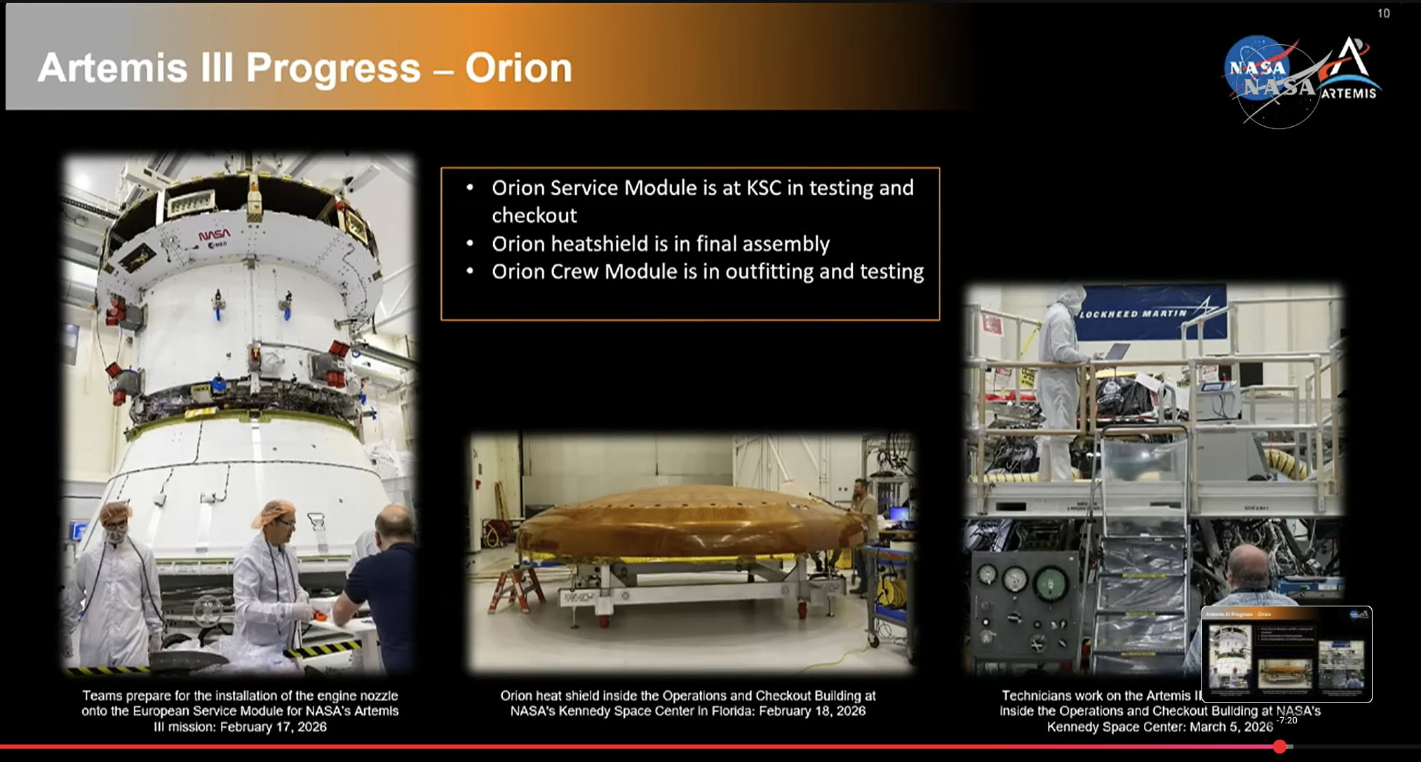Jestliže situace s nosnou raketou SLS vypadá vcelku nadějně, s Orionem je to momentálně trochu horší. Představitelé NASA v březnu oznámili, že pod modul pro posádku pro Artemis III dosud nebyl instalován tepelný štít. V případě Artemis I byl tepelný štít instalován 44 měsíců před vývozem sestavy na vzletovou rampu, v případě Artemis II šlo o 31 měsíců. V případě Artemis I je možné odečíst 4 měsíce, které tehdy Orion strávil na cestě do Glennova střediska a zpět pro testy v tamní vakuové komoře. I oproti Artemis II nyní existuje potenciál odečíst několik měsíců vzhledem ke skluzu v roce 2024, kdy musely být překonstruovány baterie v modulu pro posádku, přeinstalovány elektronické prvky systému podpory života a identifikována hlavní příčina eroze tepelného štítu při návratu z mise Artemis I.